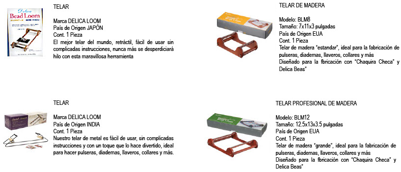Nuestros telares son herramientas amigables y fáciles de usar, diseñados para tejer cuentas de vidrio de diferentes tamaños y formas, ideales para proyectos finos y de gran envergadura. Todos nuestros productos son de la más alta calidad por lo que garantizamos la plena satisfacción del cliente.