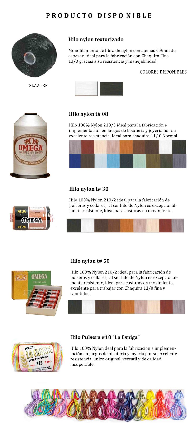 Nuestra empresa DISTRIBUYE Y COMERCIALIZA las mejores marcas de hilos ideal para la elaboración de aretes, pulseras, collares y un sin fin de productos, brindando siempre la garantía y seguridad a todo lo que usted realice con estos.
